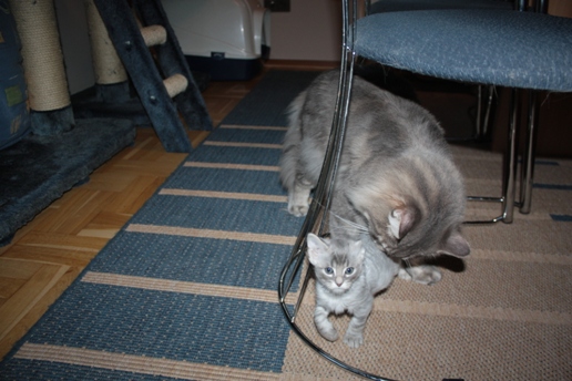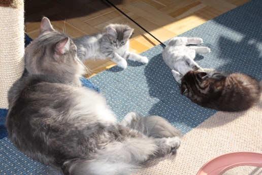 Und auch meine Jalla übernimmt jetzt einige Aufgaben bei der Kittenerziehung. Sie ist zwar selbst noch nicht einmal ein Jahr alt, aber sie fühlt sich sehr wohl zwischen den Babys und putzt und bemuttert sie. Elena nimmt die Hilfe der Beiden super gern an und genießt die Gesellschaft.