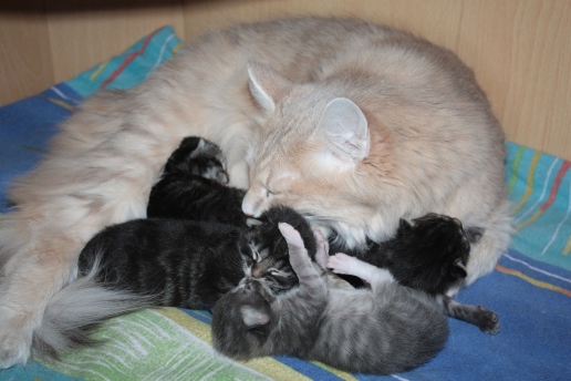 Jetzt sind auch Bibby`s Babys endlich da.... Doch leider sind die Babys einige Tage zu früh zur Welt gekommen. Die kleine Kaya war noch nicht voll entwickelt und ist trotz kämpfen, bitten und bangen am fünften Tag über die Regenbogenbrücke gegangen. Ich werde immer an Dich denken kleine Maus und dich stets in meinem Herzen tragen. Den beiden anderen Kitten geht es aber prächtig. Sie nehmen sehr gut an Gewicht zu und entwickeln sich klasse. Allerdings ist Bibby mit zwei Kitten noch lange nicht zufrieden. Sie hatte ja schon die ganzen letzten Wochen immer bei ihrer Tochter Elena mit in der Wurfkiste gelegen und die Kleinen umsorgt und gepflegt. Als dann bei ihr die Wehen einsetzten, ließ sie es sich nicht nehmen, ihre Babys bei Elena und deren Kitten zu bekommen. Die ganze Zeit über rief sie die Kitten immer wieder zu sich. Ganz entgegen meiner Annahme, die Kitten hätten besseres zu tun, als sich neben Bibby zu legen, waren doch immer wieder einige der Kitten nur all zu gern bereit ihr Gesellschaft zu leisten. Meine anfängliche Angst, die "Großen" könnten die Neugeborenen versehendlich verletzen, da sie ja doch schon sehr spitze Zähnchen haben, die beim Toben und Spielen auch schon mal mit eingesetzt werden, bestätigte sich in keinster Weise. Als ob sie ahnen würden, dass die "Kleinen" noch viel zu klein zum Spielen sind, legten sie sich nur dazu, putzten sie und kuschelten mit ihnen.