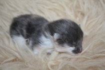 Nala ist auch ein kleines Mädchen in der Farbe blue-tortie / white. Sie hat sehr deutliche cremefarbene Flecken über ihren ganzen Körper verteilt. Die Nase ist ganz blau, und unter ihrem rechten Auge hat sie auch creme und etwas mehr weiß als auf der anderen Seite.
